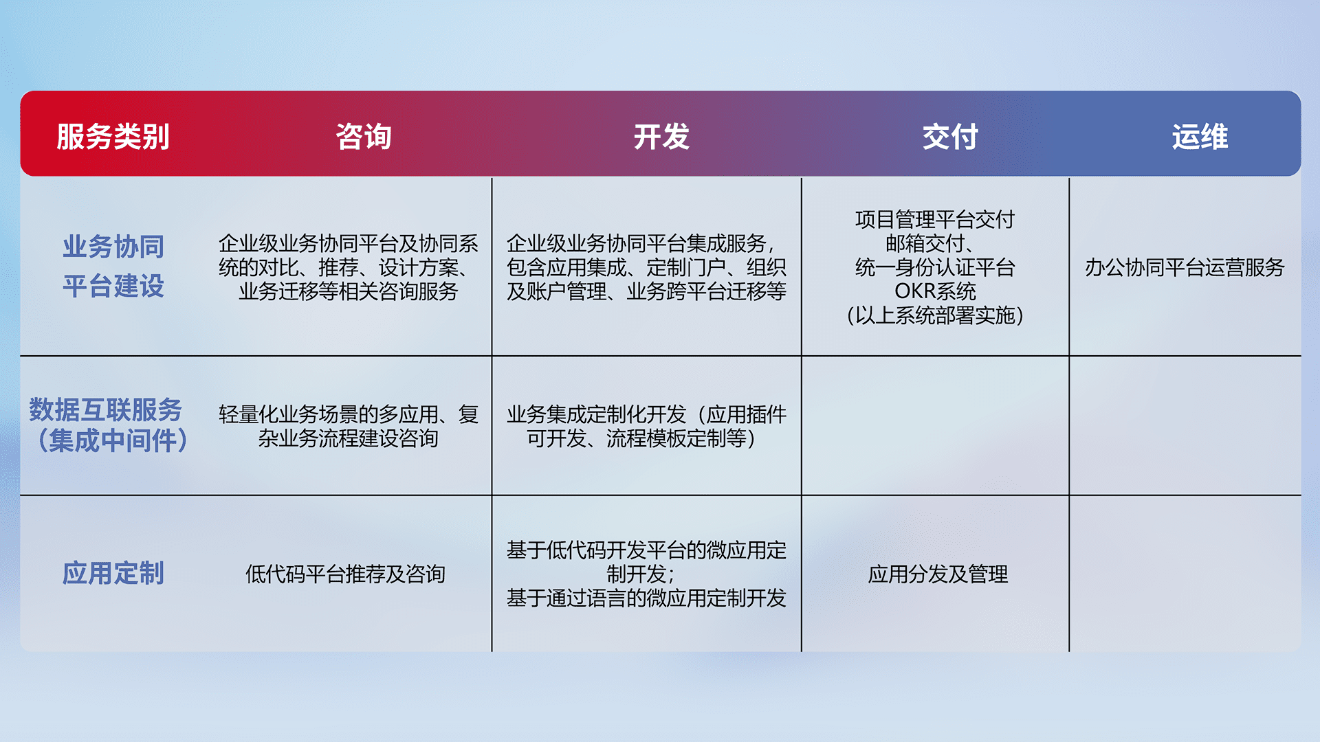 针对钉钉、、、、企微、、、、IDaas等平台级产品提供产品的规划、、方案、、、、交付、、、、定制化开发等服务,,实现如统一协同办公、、、、智能客户服务、、混合会议管理、、、、智能数据查询、、、等业务场景,,,,实现数字化转型。。
