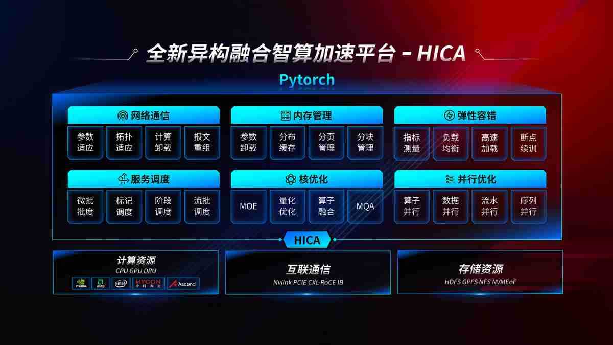 通过自研的服务层、、、中间适配层、、、、以及调度编排算法,,,,采用数据并行、、、模型并行等多种并行方式,,,把并行计算任务进行有效的分解,,,使其分别由相应的软件栈和算力资源来承接。。。。当GPU资源变化,,,,HICA可以实时动态调度计算子任务并调整模型拓扑和架构,,以充分聚合各种算力资源。。