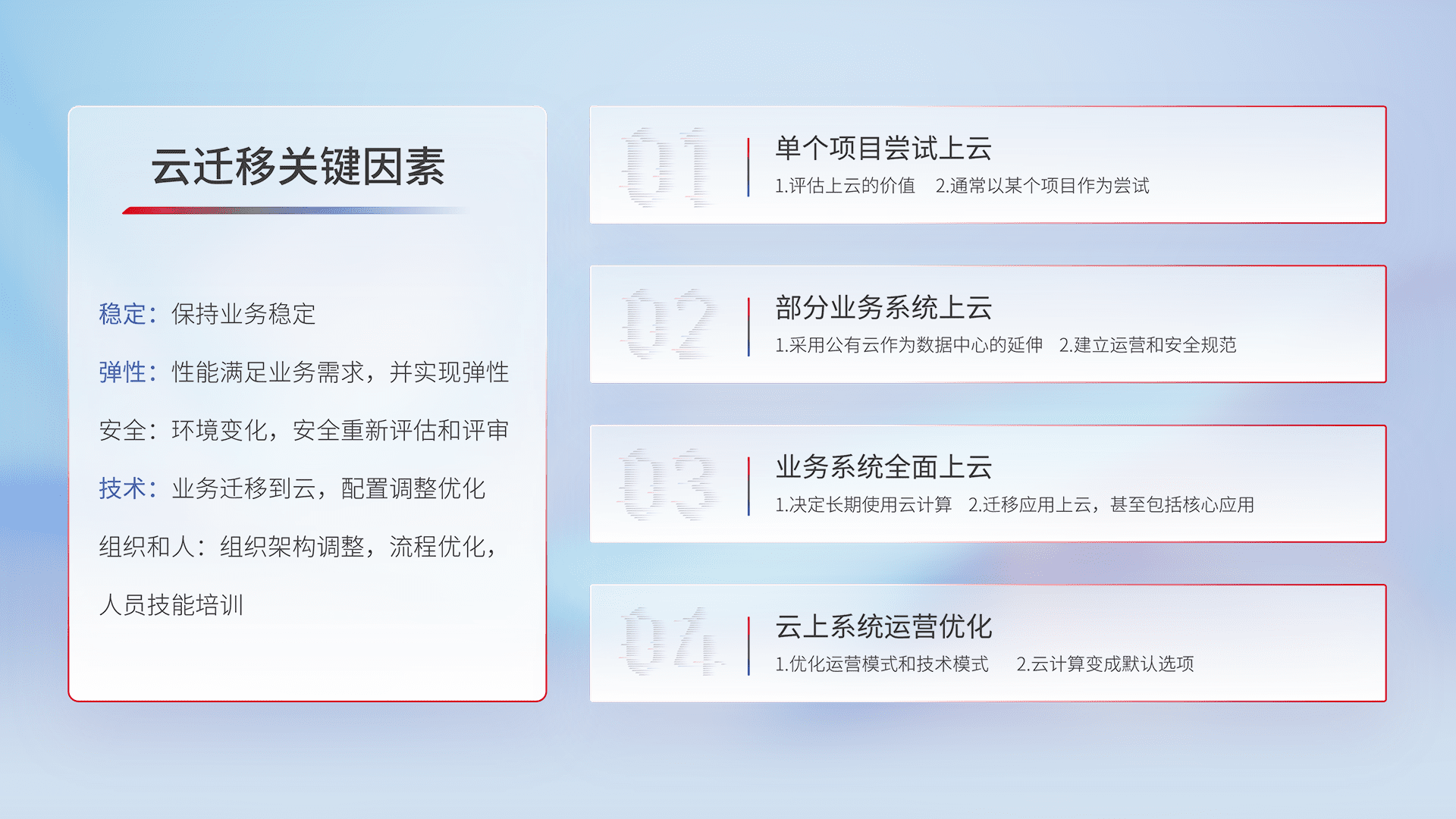 结合实际业务,,从规划设计、、、、云平台选型、、云原生改造、、、、数据迁移、、、、集成交付,,,迁移全过程为客户识别最佳上云路径,,,,做好风险识别管理,,,设计网络架构、、、、身份权限、、、安全审计合规、、、操作审计、、、日志审计、、、、监控告警策略、、、、多站点容灾设计等,,对云上基础设施进行整体规划,,,,提升IT治理水平,,,,以满足弹性、、高可用、、、、高性能的需求。。