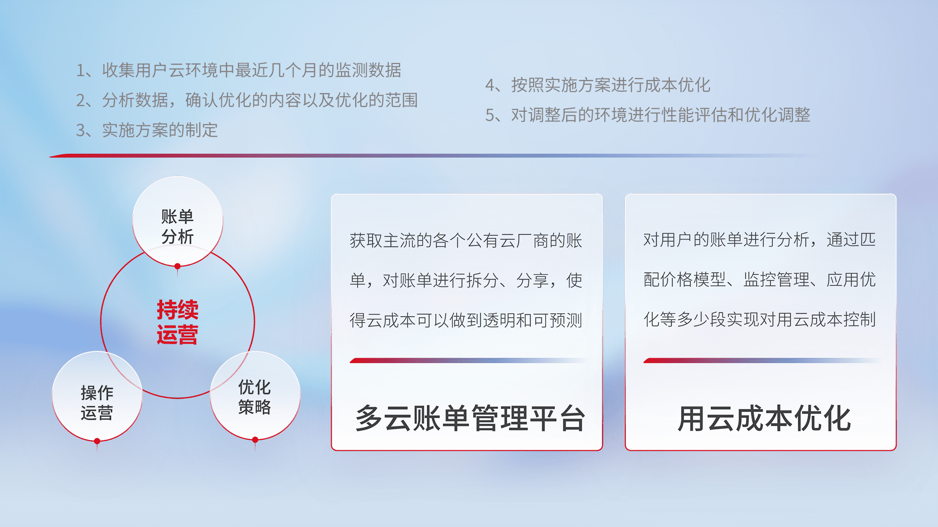 通过多云纳管,,以统一的资源数据模型把客户的云资源进行抽象和封装,,,进而实现对多云资源的统一操作,,,保障云资源管理的可靠性、、、、稳定性与可用性。。量身定制化运维内容,,,配置、、开发运维、、补丁管理、、备份、、、监控、、认证和访问管理、、、、审计和日常巡检等,,,保障在用云过程中的可靠度,,,,稳定度以及高可用率。。。